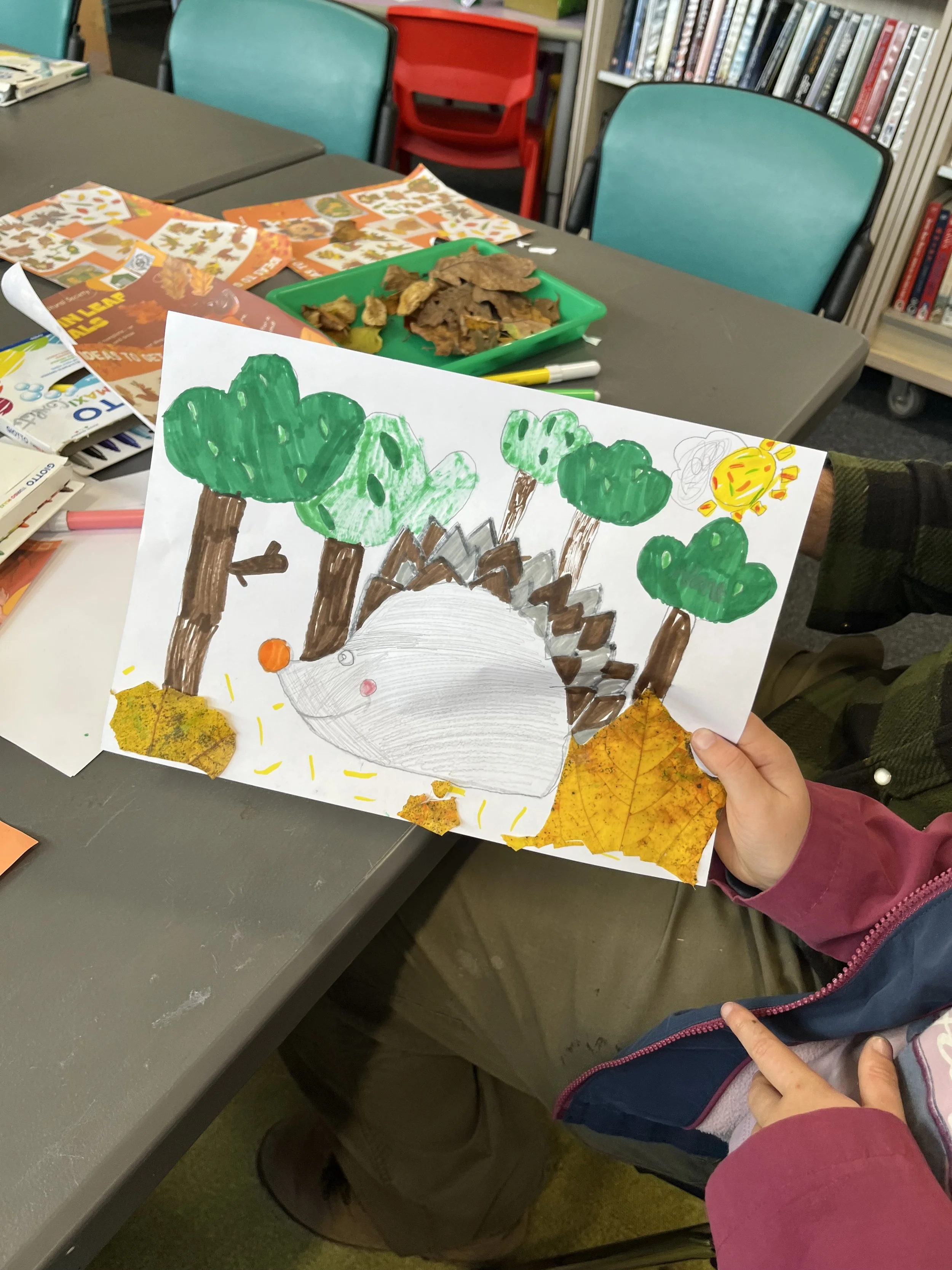 The children used our templates to stick leaves to create the spines of a hedgehog, tail of a squirrel or wings of an owl but many also used their own imagination creating their own illustrations and using the leaves to make lions, rabbits and more!